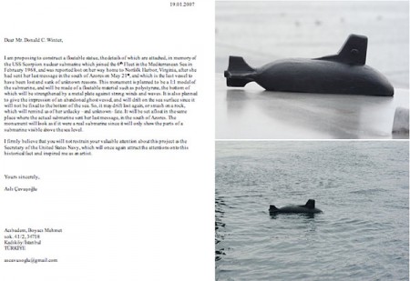 With such projects, Çavuşoğlu demonstrates the basic truth that what we know as “history” is often the the result of largely subjective processes, and an artist’s version of history, whether rendered as an object, book, film, or document, can be just as true or untrue as that created by historians–or, depending on the country and moment in time, politicians masquarading as historians. This understanding of the malleable nature of history lies at the core of Çavuşoğlu’s practice. Projects such as the “Monument Proposals” series, in which she sent proposals to the governments of several countries for national monuments that she knew full well would never be accepted–such as a proposal to the U.S. Navy to create a monument to the USS Scorpion, a nuclear submarine which was lost at sea in 1968 due to mechanical failure–test the limits of memory and representation when it comes to issues of national memory. At the same time, projects such as The Petty Travel Show For a Dear Audience, in which Çavuşoğlu created a nine minute, forty second video from many hours of footage recorded by her aunt and uncle of their tourist trips around the world, are more concerned with historiography on the micro level, the creation of personal rather than national histories.