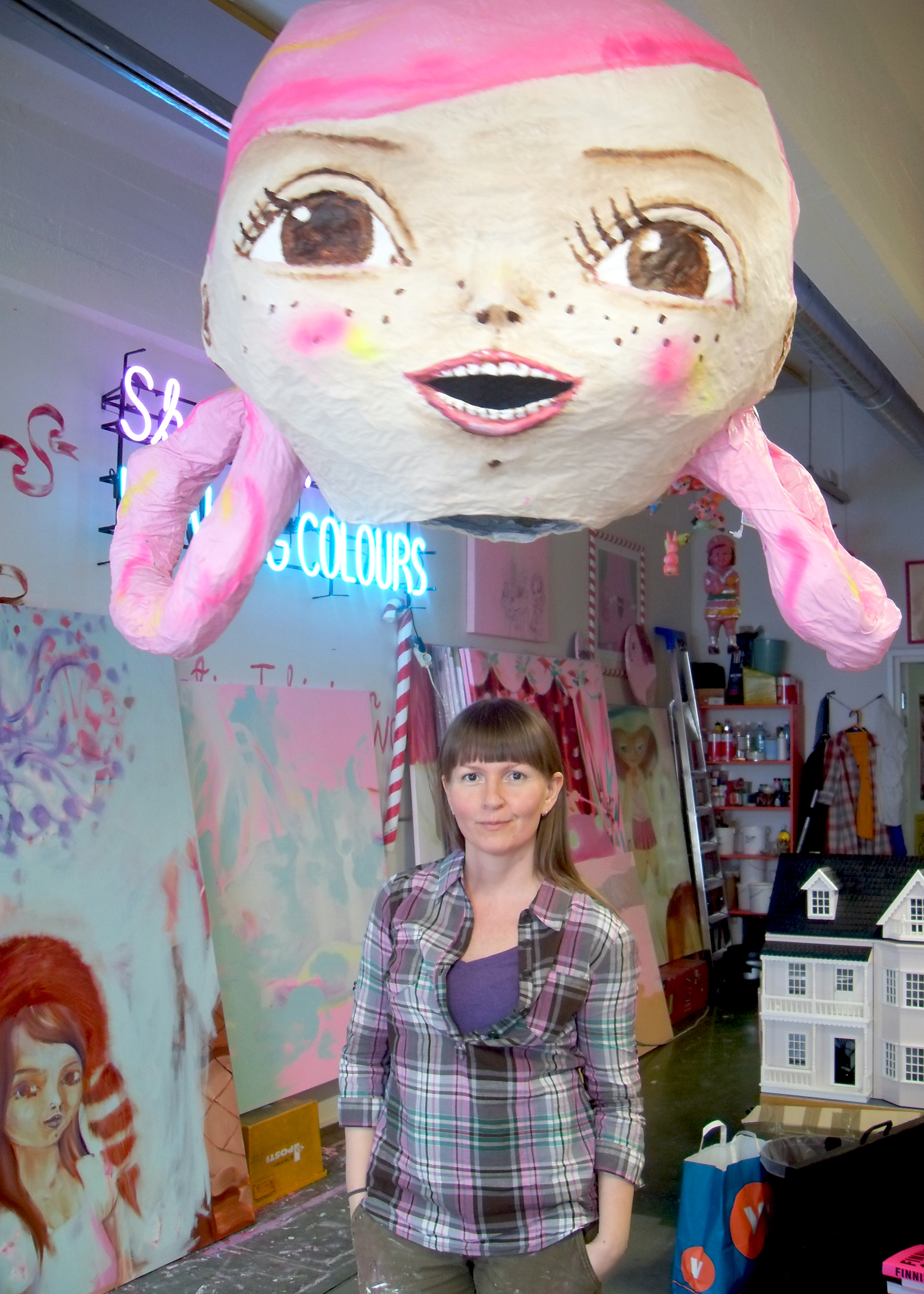 We can’t all be escape artists, but Katja is. As such, however her work is not soft on content or politics. Her paintings, comics, and installations invite the viewer into another world—a better one, a pink one. Leaving that world behind begs questions about what the real world actually looks like. Soon I will find out for myself. I will leave Finland with the image of pink clouds emblazoned in my mind, with Katja’s words: “feet on the ground, head in the clouds” in my thoughts.