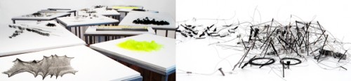 In the Fall of 2000, I had a solo exhibition at the Museum of Contemporary Art Chicago.  In addition to a range of other works utilizing found cloth and hair, I made a large sculpture called Feast that occupied its own exhibition space. Feast was a huge table, 22′ in length, and the stitched holes and tears from table linen — a vocabulary of parts stitched over 10 years — were placed back onto the horizontal table surface creating a kind of abstract topography.  In developing Feast, I wanted to investigate aspects of perception, the optical imagination and relational ideas extending from the body and social space. I became interested in new ideas suggested by the horizontal format; ideas to do with mapping, navigation, architecture, and landscape.  Also the power of a raking view—looking both down and across at a field of complex activity.  This was the first piece that proposed this dual scale, suggesting both micro and macro worlds.