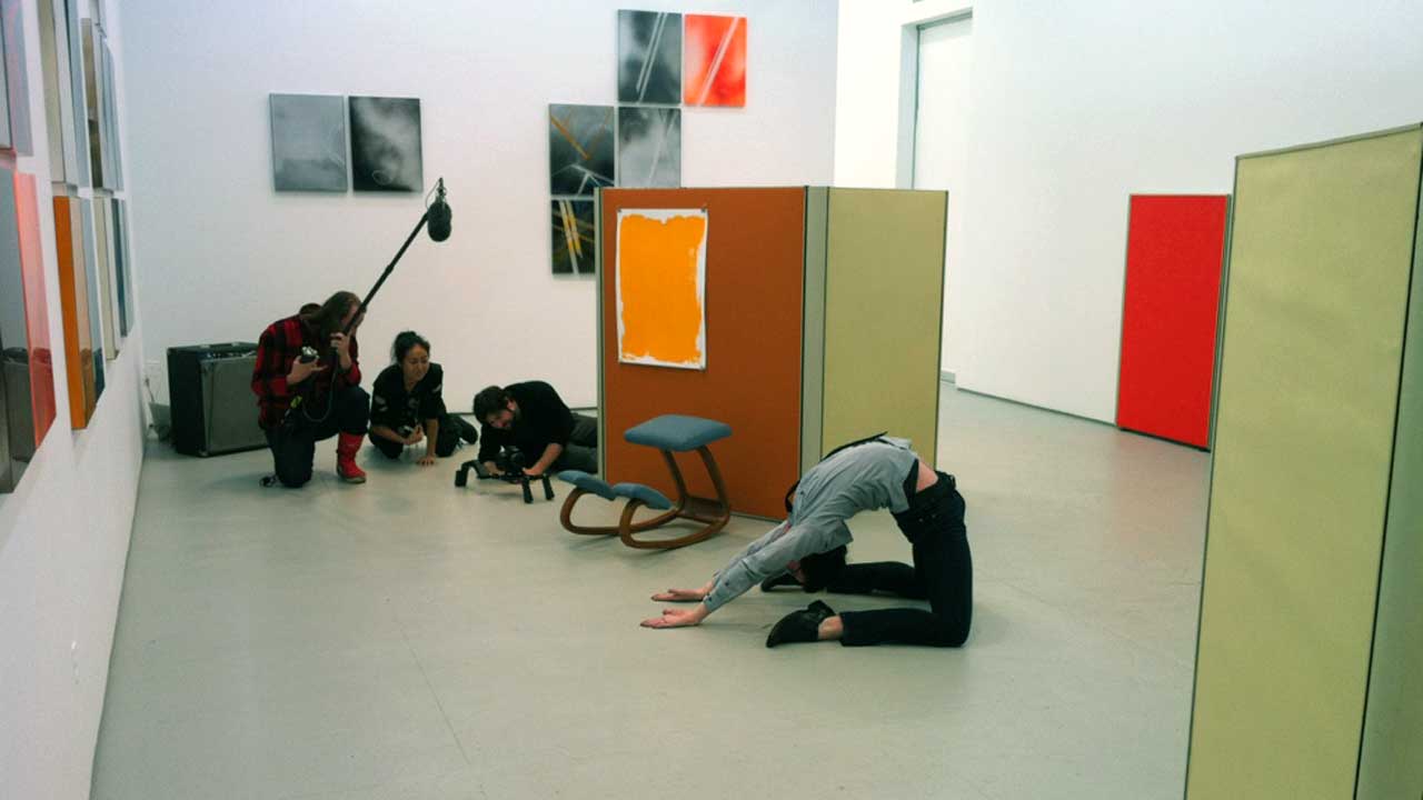 Curator Wesley Miller, artist Mika Tajima, and cinematographer Jarred Alterman film contortionist Tony Mitchell performance during an exhibition at Elizabeth Dee Gallery. Chelsea, Manhattan, 01.29.11. Production still from the series "New York Close Up." © Art21, Inc. 2011.