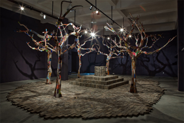 Maya Kramer, “From Where It Springs,” 2009. Recycled wood, old bricks, magazines, trash, computer, speakers. Courtesy the artist.