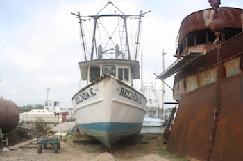 Leshinsky and Moser are taking their work seriously, laboring almost as if their livelihoods depend on it. “It’s a goal of ours to be committed to learning the profession well enough so that what comes from it is as relevant to as many shrimpers as possible. A big part of that is paying the dues of working on the boat.” The guys recently Skyped with me from the boatyard where they have been working for the past four months, roughly twelve hours a day in relentless Texas heat, rehabbing their salvaged vessel, The Belinda K. This part of their ride has already been choppy: their boat was scheduled to launch with the beginning of the Texas Bay shrimping season in late spring, but necessary boat repairs have put them months behind schedule. In about a week, The Belinda K. will finally return to the water with Leshinsky and Moser as her deckhands. Their captains, a few hired local experts, will take turns on the boat, teaching the artists how to shrimp in their first year. “We’re going to try and go out as much as possible,” says Leshinsky. “We’re humbled by how much we need to learn.”