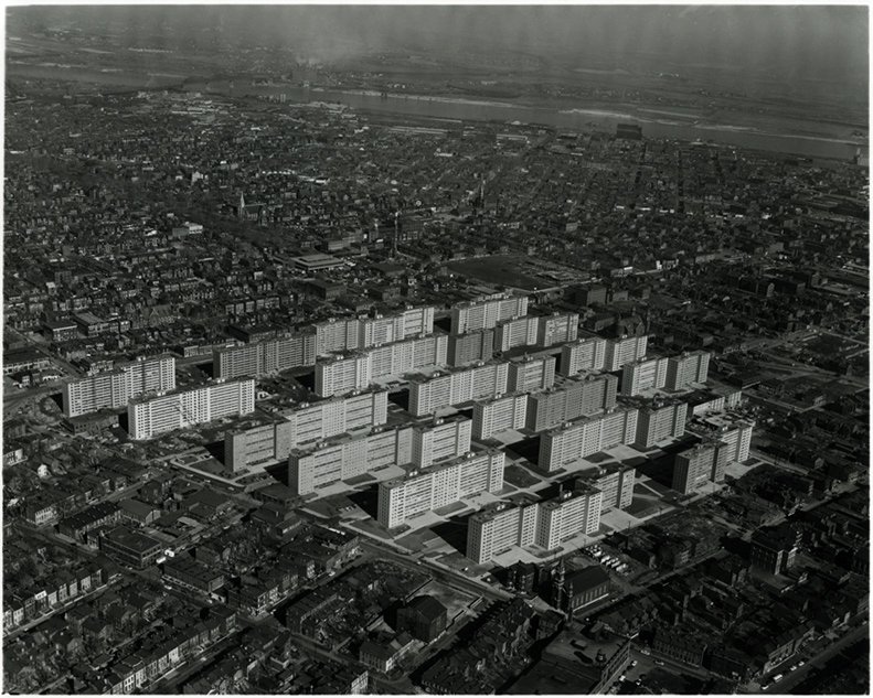 When constructed in the mid-1950s, Pruitt-Igoe represented the hopeful vision that the city of St. Louis would maintain its steady population growth. As government officials and other stakeholders saw it, increased populations meant increased real-estate values. As a result, low-income housing was tasked with cleaning up the sprawling slums through systematically concentrating people in modern high-rise structures. At its peak, Pruitt-Igoe housed roughly 15,000 people in thirty-three eleven-story buildings. However, the rapid onset of white-flight and suburbanization revealed the many flaws in this plan. Pruitt-Igoe failed for a number of reasons, including Yamasaki’s architectural design, inadequate maintenance of the building, and decreasing tax dollars for public housing. Released in February of this year, a new documentary titled The Pruitt-Igoe Myth paints a much more complicated picture of Pruitt-Igoe than has been told in the past, sharing first-hand accounts of former tenants that help to humanize the housing development.