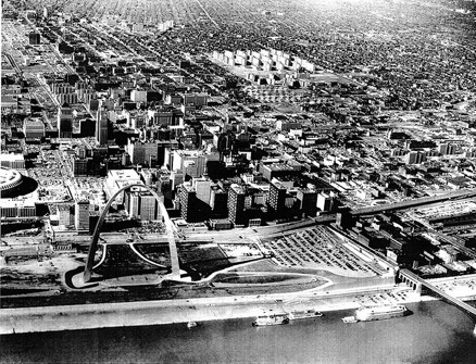 Saint Louis skyline with Eero Saarinen's Gateway Arch in the foreground and Minoru Yamasaki's Pruitt-Igoe housing development in the back right. Image from "The Pruitt-Igoe Myth" documentary.