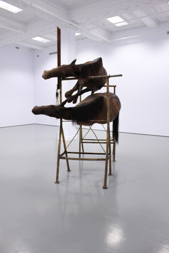 One of two rooms in De Bruyckere’s exhibition consists of casts of real humans created site-specifically for DHC – Invisible Beauty and Invisible Love (2011). In these works, boneless and headless bodies hang vulnerably from pole-like structures fixed off the ground, to the walls. They are as arrestingly beautiful in their carefully-rendered technique and form as they are disturbingly deformed and mutilated in their meaning. There is also a trestle holding two actual-size brown-haired horse figures in a piece entitled Les Deux, (2001), in which the creatures are stacked horizontally atop one another inside a precarious scaffolding structure. Their cultural symbolism suggest extreme weight and heaviness, but of course they are actually comprised of lightweight materials. Despite their stiff and vulnerable positioning, the horses appear vibrant and life-like, still powerful with the potential of wild horses in wait. To see a horse – a symbol of strength and war – in a position of defeat, loss, and compromise, points also to the fiction of the steadfast, heroic narrative. Soldiers fall, horses too. And war is very much about death and suffering of actual bodies. The two horses’ majesty is interrupted by the disturbing trestles in which they lie on exhibit, but also by their lack of facial features and the absence of their eyes – a gateway into identifying with the animals which we commonly associate with humans. The human body sculptures on the other hand, cling inwardly, the centre of their sinewy bodies are wrapped in a way around pole-like structures, seemingly resisting the world outside them. The physical agency is introverted, like someone who has failed or fallen, and its body center – its heart – hides from spectators; this is shame personifed. The bodies are without heads and without eyes, and so spectators can look, gawk, and gaze without being seen. The scrutiny extends beyond the material instantaneously, lending itself to parallel the political realm.