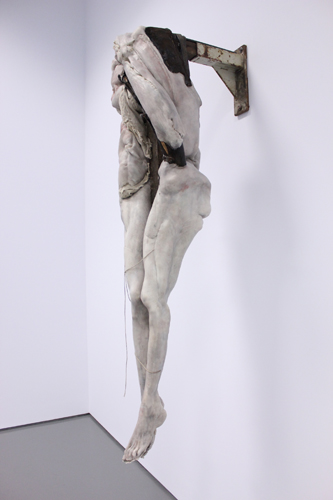 Are these semi-crucified bodies – their mangled poses, and contorted configurations – a meditation on religion, war, news media photography, or art history? Do their hunger, pain, and suffering suggest a moral plot? Or, do they provide commentary on specific events of our recent history; prisoners of Guantanamo Bay, Rwandan genocide victims, or war detainees? The sculptures conjure up war journalism photographs no doubt; fragments of torture scenes we shouldn’t see but can’t take our eyes away from either. But news discourse is a privileged and authoritative version of reality, and contemporary art holds less influential cultural capital and popular circulation than breaking, bleeding news images. No, De Bruyckere’s sculptures do more than cite a specific historic event. And though the artist is cognizant of art history, her works do not necessarily offer an inventory of the history of art, either. Though the sculptures on display at DHC are of individual bodies, they suggest something more than the particular: they reveal that suffering is about the world and time travel. The sculptures conjure a sense that “we’ve always done this to one another.”