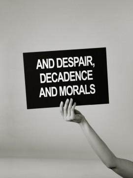 In doing research for this project, I read interviews of a wide variety of political leaders, from Castro to Thatcher to Reagan, the Albert Speer interview, John McNamara, where they are talking about where they failed. What I then did is took excerpts of those interviews that became a type of poetry—freed from their contexts and became these floating signifiers. I transferred them onto these placards that were being held aloft by a professional hand model. In doing so, I freed the text from its initial meaning and it became more of a proclamation that could be applied to general conditions, societally.
