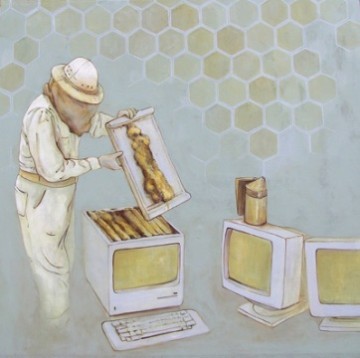 Influenced by and derived from her background in scientific illustration, Kendall’s surreal tableaux are purposely incorrect; animals and objects are recognizable but appear in unlikely environments, as though misclassified. The artist skews linearity, leaning instead toward the possibilities of the unreal: butterfly wings protrude from men’s heads, while a beekeeper pulls frames not from a hive, but from a computer monitor.