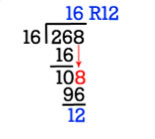 Now we write our remainders from last to first: “1”, “0” and “C” or 10C which is hex code for 268.
