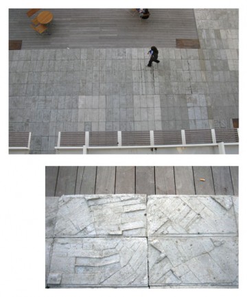 Joy Holland. Installation at UCLA Broad Art Center outdoor seating area and walkway, Los Angeles, California, 2008. Project Management and Facilitation: UCLA (Department of Art, concrete floor cast from salvaged lumber and tree fragments, 2,400 square feet).