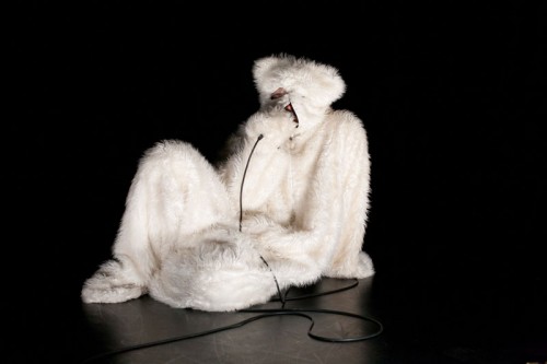 Eleanor Bauer’s solo performance Big Girls Do Big Things at New York Live Arts proved to be an outrageous adventure into the plight and privilege of the statuesque young choreographer. Slipping into a polar bear suit as she took the stage, Bauer attempted to stand up despite the suit’s bulky, misshapen folds and tucks that hindered her. She kicked two small cymbals and then searched for a way to clap them together with her paws. Not merely slapstick, the bear suit performance parodied her appearance as a “big girl” in a world of idealized dancer bodies. The difficulty with which she moved, encumbered by the suit, revealed a sad truth about the projections that audiences themselves put onto stage performers. Like a circus act, the “bear with cymbal” routine symbolizes the performers’ labor for cheap laughs and approval from audiences, but when the cymbals started to become slippery, and the roly-poly behavior of the bear broke down, the dysfunction of the performer’s role is made clear.