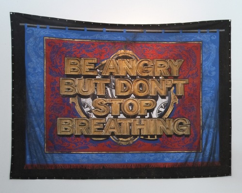 AI: “Be Angry But Don’t Stop Breathing” is an incitement to the public, but I’ve read that this is also a phrase gleaned from a poster for Dusan Makavejev’s 1971 film on Wilhelm Reich, “Mysteries of the Organism.” Gleaned from political, philosophical, and psychological works and song lyrics, language and text is a prominent aspect of your work. What draws you to these statements and how are you reappropriating them in your work?