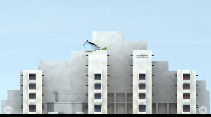 - Do Ho Suh‘s Fallen Star is under construction at The Stuart Collection, University of California San Diego. Fallen Star takes the form of a small house that has been picked up by some mysterious force, (perhaps a tornado) and “landed” on a building, seven stories up. A roof garden is part of Suh’s design and will be a place with panoramic views for small groups to gather. This can be seen as a “home” for the vast numbers of students who have left their homes to come to this huge institution, the university, which has nothing even resembling a home. A video detailing the installation process was commissioned by The Stuart Collection: