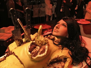 Abramović’s plans for MOCA’s Annual Gala were met with controversy weeks before the event took place. (Art21 blogger Catherine Wagley covers this at length in her latest post.) If you thought her use of people as dinner table centerpieces was disturbing, dessert wasn’t far removed. Teamed up again with the art and dessert group Kreemart, Abramović presented guests with two cakes: a chocolate one made in her likeness and another in red velvet that resembled Blondie front woman Debbie Harry. Needless to say, the normally joyous act of cutting cake looked extremely creepy.