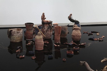 Peter Nadin. "Raft," 2011. Honey, terracotta, wood, twine, bank run, wax and ham, 288 x 288 x 9 1/2 in.