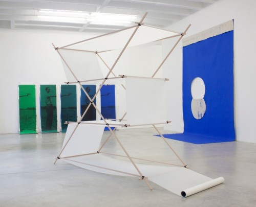 If the aleph makes us picture a negation of sight that occurs through the simultaneous presence of too many perspectives, inversely Premnath’s work also presents us with a series of ciphers: those figures awaiting signification, meaning-making, desire, which appear ostensibly “blank.” In his work the cipher is a site of possibility in the imagination, or within said language games, where socio-political transformation, but also the potential for socio-political violence and cultural-historical displacement, would seem to co-exist. So we see in the installations Green Screen and Zero Knot forms of political gesture without content: a hand extended, or seemingly waving. Signage without slogans or demands also appear throughout Premnath’s work, an index of events yet-to-come, or as-yet-unresolved.