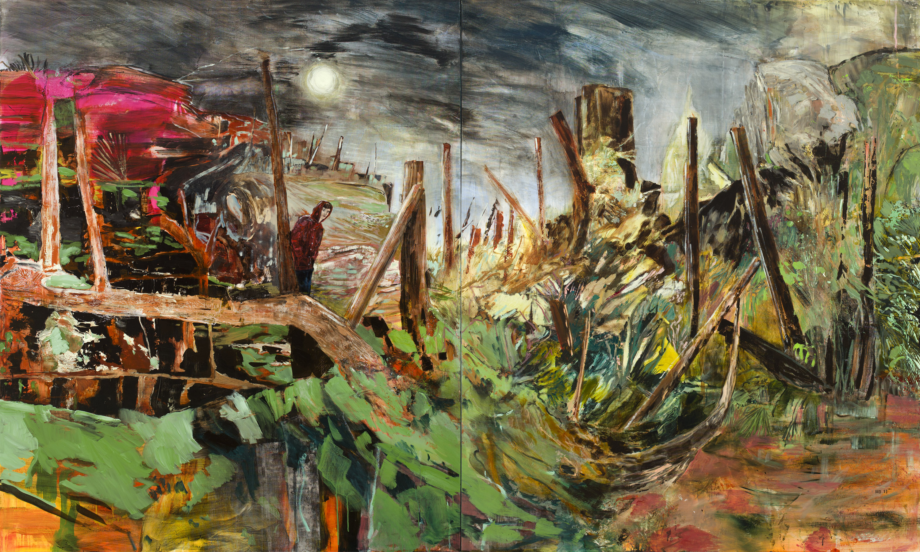 SMP: As your work has been transitioning from inside to outside, from figurative to landscape, and from intimate to epic, the compositions have taken on a different kind of otherworldly, fantastic quality. Even this work in progress, [The Jack of the Lantern], is composed of an almost precarious arrangement of forms that seemingly would tumble out at you if not for that fence in the immediate fore. I think your work influenced by Russian constructivist staging particularly evidences this recent development—creating Tatlin-esque towers to frame the central-subject which dissolve into abstraction. It seems that your work is creating self-contained spaces of pure fictionalization, and I guess my question is how you play with the imaginative potential of the medium as a painter?