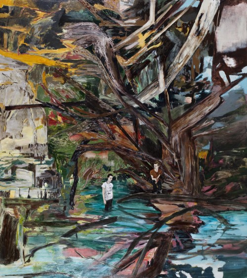HB: I do like the idea that everything is contained—the entire narrative, within the frame of the canvas; but paintings that I consider to be successful are always on the verge of falling apart. To me, that’s the fun of it—the eminent collapse, and also the challenge. The formal clichés about composition do play into it, but then when I look at paintings that are the least successful in the formal sense, they are most successful from my perspective as the painter. The scale, proportions, and things like that don’t figure in too realistically into my work. Sometimes the work can be described as flat, but I don’t particularly mind that, because to me it is a collage of elements. In terms of this painting [The Jack of the Lantern], the scale is relatively intact in relation to the figures, but then you have these giant vines which can either be seen as adding to or enveloping the painting—almost like they’re attacking in defiance of being a proper painting. I think the best paintings that I’ve done are overgrowth, and you have to sort of chop through to get to what’s going on.