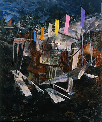 SMP: As your work has been transitioning from inside to outside, from figurative to landscape, and from intimate to epic, the compositions have taken on a different kind of otherworldly, fantastic quality. Even this work in progress, [The Jack of the Lantern], is composed of an almost precarious arrangement of forms that seemingly would tumble out at you if not for that fence in the immediate fore. I think your work influenced by Russian constructivist staging particularly evidences this recent development—creating Tatlin-esque towers to frame the central-subject which dissolve into abstraction. It seems that your work is creating self-contained spaces of pure fictionalization, and I guess my question is how you play with the imaginative potential of the medium as a painter?