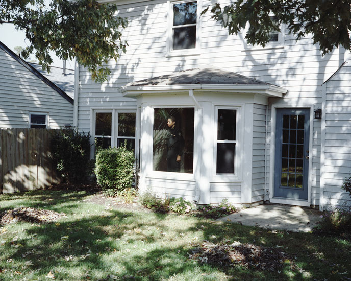 For several years Hanasik has photographed Sharrod, a young African-American man who has spent much of his life within the U.S. military system. The images of Sharrod that make up “I slowly watched him disappear” reveal a great deal about how the body is made into a sign for things totally unrelated to its everyday biological functions. Who this young man is outside his (chosen?) career path is a tantalizing secret that hovers evasively beneath his intense gaze and his salute. Hanasik has taken Sharrod’s picture in a number of civilian spaces that accentuate his presence as a soldier. They also remind us that we are free at any time to see through that layer of social reality. Sharrod’s role as a cadet and future warrior is the visual starting point for any other question we might pose about who this young man is in the world.
