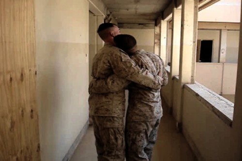 In October of 2011, a number of San Francisco artist Jason Hanasik‘s photographic and film works were installed at Krowswork Gallery in Oakland. Hanasik has become well-known for his portraits of military men. His images are uncluttered and sparse, but there is always something quietly seductive in the way they lure the eye beyond a first impression of simplicity. Hanasik’s photographs are only one aspect of his multimedia installations which incorporate film-footage and occasionally objects. When seen as a whole, these function not only as intense, visual biographies, but as serious tools for deconstructing the performance of “the self” in both public and private spheres. The lives of soldiers have given Hanasik an effective way to explore the processes of self-fashioning and self-revelation. In two of his projects, “I slowly watched him disappear” and “He Opened Up Somewhere Along the Eastern Shore,” Hanasik focuses on gestural control and the expression of spontaneity between men to get at deeper questions of identity, and to collapse our social ways of seeing men’s “innate” qualities.