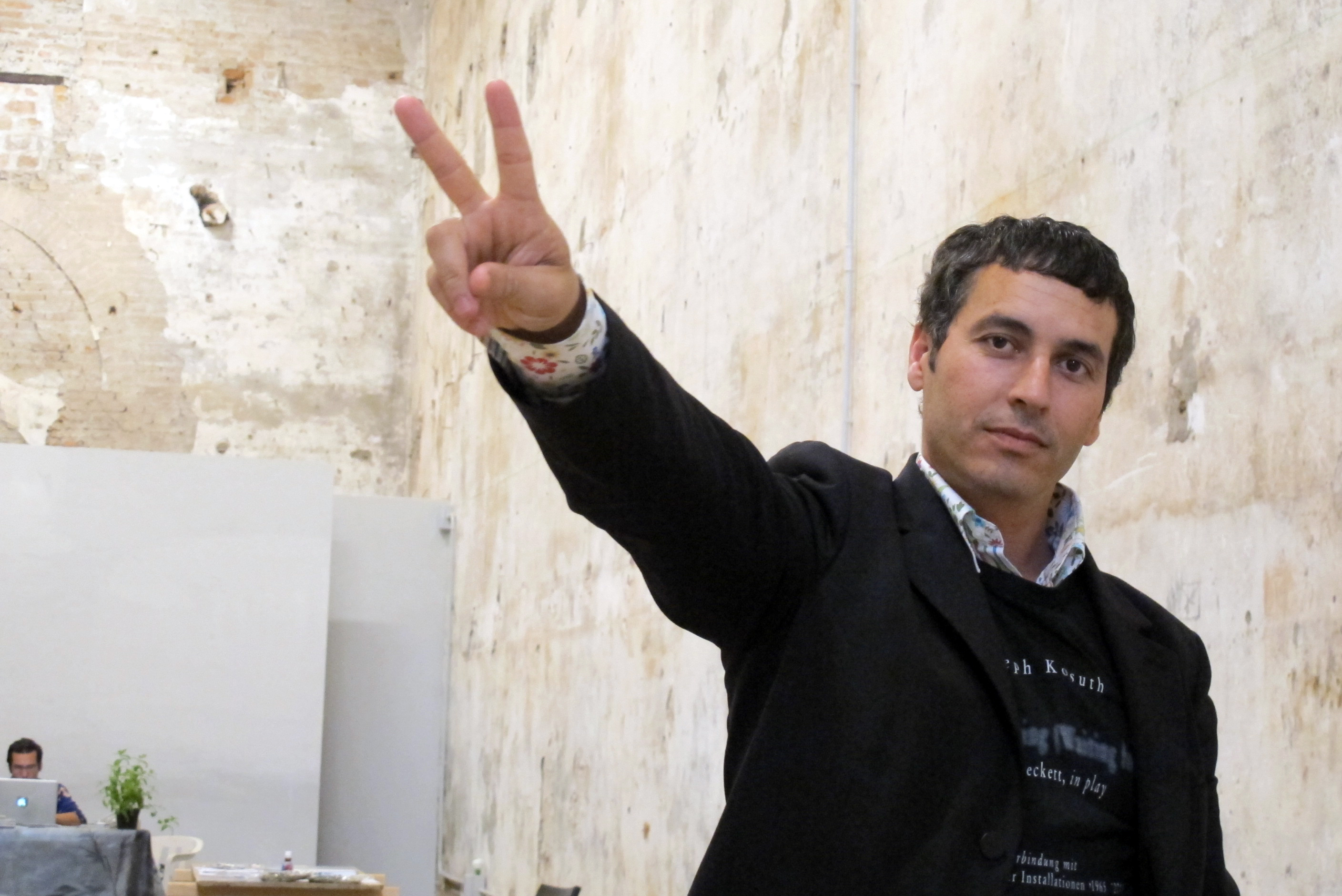 AK: The Biennale is supposed to be a place for debate, at least in theory, as it is a place where artists, theorists, and producers are supposed to meet and confront their concepts and proposals. The position of this project was precisely to create a place where we could denounce the spectacle of the art system and the absurdity of national representations. So the trip to Venice was one part of the project, and we stayed for three months, from June to August 2011. The set up was a base, organized in such a way that the same space could be shared – permitting visitors to see artists’ projects while curators continued working. No walls were built, and no artworks were installed on the existing walls. The only object fixed on the wall was a TV monitor connected to a satellite antenna. We always had fruit and drinks for the curatorial team, the artists, and those visitors who stopped and asked more about the project. Some visitors just crossed the space toward the courtyard, to see the permanent studios of local artists and architects. This part of the project was made for the city of Venice, and not the Art World of Venice. I realized how much the machine of the Biennale could be estranged from the realities of the city, especially its younger generation of artists who are, by tradition, transformed into assistants for national pavilions. It reminded me of Marrakech, when the residents were all engaged to provide the tourist industry with quick services.