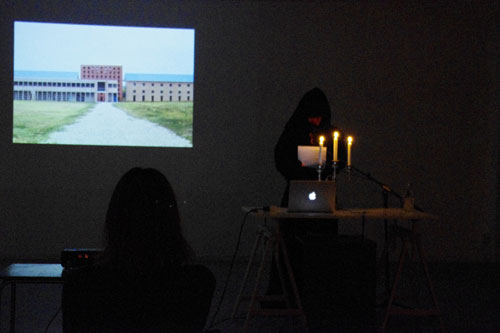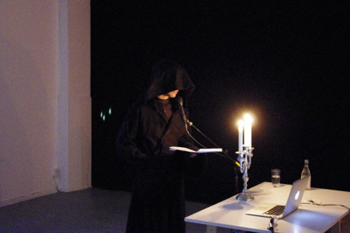 One of the events at Skånes Konstförening was a Black Metal performance held on a dark evening at the beginning of October 2011. Yuki Higashino, a Vienna-based artist, created a performance that mixed Postmodern architecture, Nordic Black Metal and holy minimalism [a term that refers to the work of a number of late-twentieth-century composers whose compositions are distinguished by a minimalist aesthetic and religious or mystical themes]. When we spoke, Yuki Higashino elaborated on the occurences onstage that night: