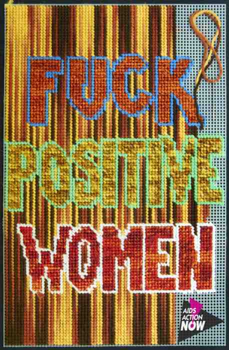 FUCK POSITIVE WOMEN can also be read as a declarative for its double meaning about how HIV-positive women are fucked when it comes to awareness, visibility, options, policy, and support on the large part. Making this kind of a rude point hopefully contributes to some of the ways that HIV-positive women can get un-fucked by healthcare, government policies, and awareness campaigns.