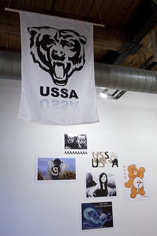 The Orphanage Project’s first incarnation at threewalls in October was a baffling and exhilarating collection of pseudo-propaganda art, sculptural flotsam and jetsam, and the Soviet bear iconography–the use of the USSA epithet in several works clearly drew parallels between authoritarian, imperialistic power here and in the former Soviet Union. Some rough drawings Cahill attributed to his orphans. The back room of three walls was turned into a darkened cave with stalagmites.