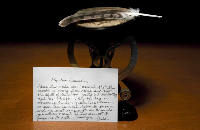 Archival remediation and revision forms the basis of three more recent works, the last of which is currently on view at MoMA, 9 Scripts from a Nation at War. In Evidence (Criminal Case 40/61), Geyer revisits the trial of Adolf Eichmann. Placing a series of objects related to the trial on a table in front of a wall of archive boxes, her photographs foreground the materialiaty of these objects, how they would seem undeniably particular and yet ciphers for historical inscription. In Comrades of Time, seven of Geyer’s friends re/enact writings and correspondence from the era of the Weimer Republic. As the artist explains, “Through this Brechtian rupture the artist is able to build a space of reflection where an individual internalisation of historical and political knowledge takes place.”
