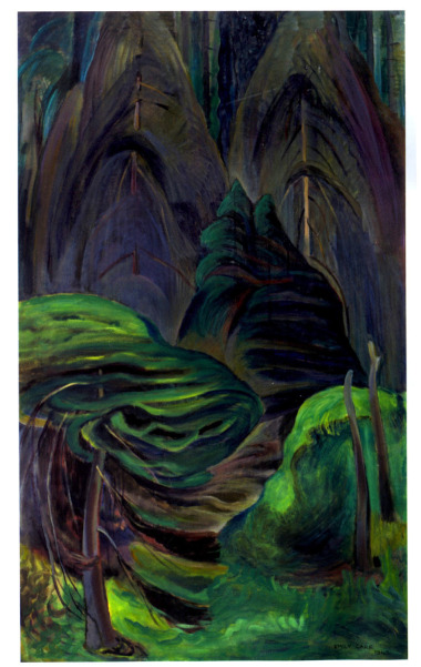 At the Vancouver Art Gallery’s exhibition Shore, Forest and Beyond: Art from the Audain Collection, I saw a middle-aged man facing an Emily Carr painting. He let out a slow whistle in disbelief, and turned to his friend to ask incredulously: “How have I never seen this before?” I understood his sense of discovery. The early Emily Carr work depicted an Arbutus – the common west coast tree characterized by its orange-red flaking bark. The colouration in the painting is expressive rather than realistic, making it quite different from the oeuvre of dark and deep forests more commonly associated with the artist’s work (as exemplified in the image below).