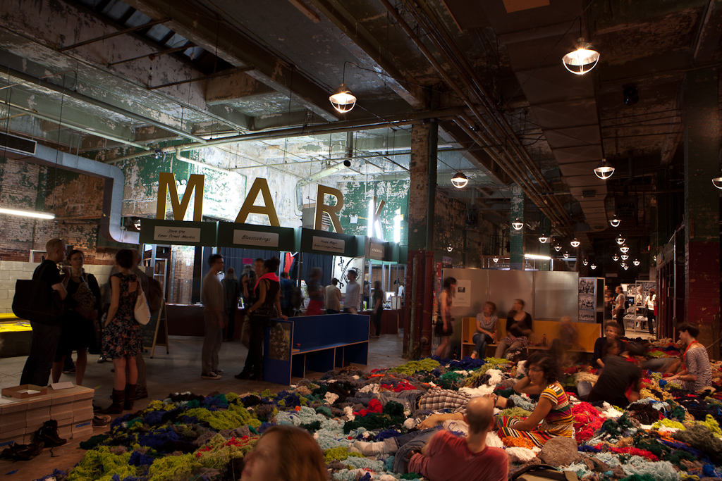 Temporary Services’ Market at the historic Essex Street Market in Manhattan’s Lower East Side during Creative Time’s Living as Form exhibition. Photograph by Sam Horine, courtesy Creative Time.