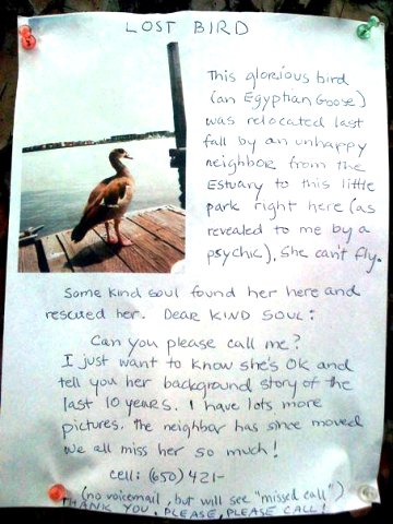Coincidences rely on missing information; we must suspect connections but be unable to prove them. These gaps in logic can be fertile grounds in which we are encouraged to conjure uncanny possibilities. One day a sign appeared in my neighborhood describing a lost Egyptian goose that a psychic had intuited was nearby.