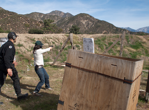 We check out our guns from a very nice group of young people all clad in black. We are issued Glocks. Glocks don’t have a traditional safety, and this totally freaks me out. But I deal with it, and I push the 9mm bullets into the cartridge and line up with everyone to listen to a very intense speech by a very intense guy named Bill who tells us how many gang members there are in Los Angeles and that gun ownership is the best way to ensure that they don’t kill us.