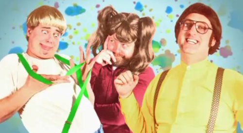 Despite his outfit, Zach is the most masculine of the three. Tim and Eric have bowlcuts (the most neutered of hairstyles) and have smooth, soccer-mom like makeup on their skin. This is a classic Tim and Eric theme: copious amounts of naively applied makeup, only serving to magnify ugliness. They wear enormous pants that erase the idea of a penis.