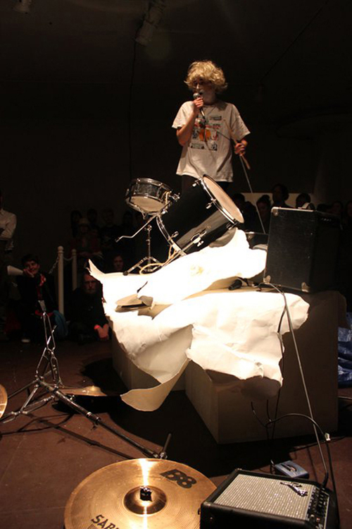 DK: That’s an incredible question. Yes, I’ve been thinking about my work in a different manner since being here. I feel like this is definitely a stepping stone, or really a milestone. In order to do the next work I want to do, I needed to do this. I’m interested in durational performance, and it’s a bit blurred that in fact this is durational performance. It does address issues with respect to performance art and its lineage. The mess, clutter, bits of text and images, the “work-in-progress” feel form a subtext about durational performance and its effect on artists in this day and age–on my generation. Everyone’s talking about the word “performance” in lights, but I don’t see a huge need to compartmentalize it. I think it’s interesting to explore the degrees of ability that performers have under the umbrella term of “performance art.” Obvious forms are theater and dance, but there are also other approaches to performance art. Even within those forms, there are subtexts or sublevels of interest. I’m fascinated with exploring performance art in the many facets of what it has to offer.