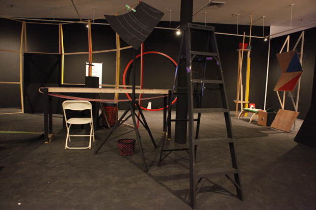 In this line of thinking, Meromi has created works like Rehearsal Sculpture at Art in General, setting up spaces for interaction, creating series of props and scripts, but allowing audience and occasional performers plenty of space to interpret these materials as they wish. Specifically in the case of Rehersal Sculpture, Meromi painted over the entire space to turn it into a black box, but by including a set of risers that could also serve as platforms and providing no clear boundaries for the rest of the space, he transformed the entire space into a potential stage. During a series of Rehearsal events, Meromi invited collaborators to come in and lead workshops, some of which were more overtly performative in nature than others. The one I attended drew its inspiration from a constructivist-style collage but shifted that composition into a group performance.