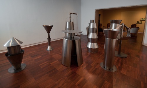 Born in Martinique, Latamie has in past exhibitions used coconut, sugarcane and other commodities to reference Caribbean colonial histories. Now taking absinthe as his focus, he’s erected the coolest of distilleries. Each of its sheet metal stills is modeled after one of the nine males or “malic molds” of Marcel Duchamp’s The Bride Stripped Bare by her Bachelors, Even (The Large Glass) (1915-1923). The forms give off the faint scent of anise and other aromatic herbs indicative of French aperitifs. A gallery attendant told me that this olfactory detail is merely for affect. These stills were never functional but meant to be symbolic — “an abstraction of what absinthe means.” The artist explains in the exhibition text, “I was trying to give this installation a dynamic based on the sense of desire, more than demonstration.”
