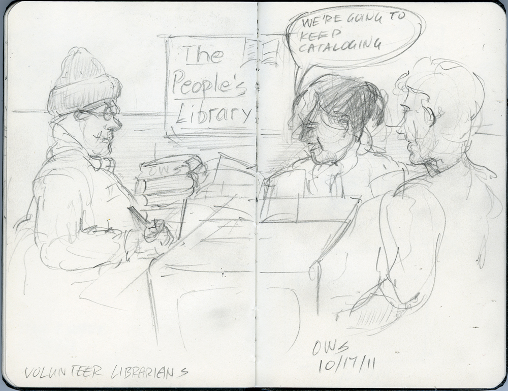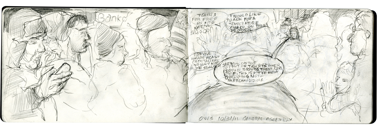 When Occupy Wall Street appeared, I realized that here was a real utopian society, not far from my apartment. I didn’t camp out, but I was inspired to respond right away, doing things I’d never done before as an artist. I’d be at these General Assembly meetings, drawing in almost total darkness, making a kind of documentary comic book. I started to think back to Courbet and Manet documenting the end of the Paris Commune. Though it might only be one city block wide, OWS was a radical theater of the people. I wanted to do more than just document. I wanted to contribute something. As it happened, I was reading a biography of Brecht and discovered he wrote a play called “Days of the Commune.” I knew what I must do. I had to put on the play right away. That is something that Occupy really reaffirmed for me, that one must act now without waiting for funding or permissions.