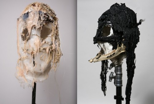Previous articles and interviews with Nader conducted by Invisible Oranges, NPR, and Vice have largely focused on his collaborations with iconic Metal musicians (whose mythic careers Nader has also deliberately folded into his concept for the In the Flesh project) and his masks for Attila’s stage performances. Although Nader uses music as a medium, he does not describe himself as a musician. (Nader directed the sound of In the Flesh, but his actual part in writing the compositions was minimal.) Furthermore, his work with Attila is only part of his ongoing mask projects. In order to emphasize and contextualize Nader’s artistic decisions, I’ve decided to focus here on the virtual lexicon that he is building as he infuses objects—such as petroleum, the guitar, hair, and sulpher crystals—with new meanings, values, and ritualistic powers. So, without further ado:
