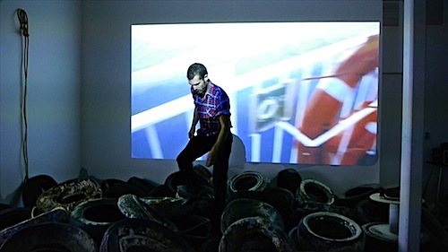 Artist Hannes Bend in his 3-channel video and found object installation "Reef" at his solo show "Eclipse," which opened at Charest-Weinberg Gallery in March of this year.