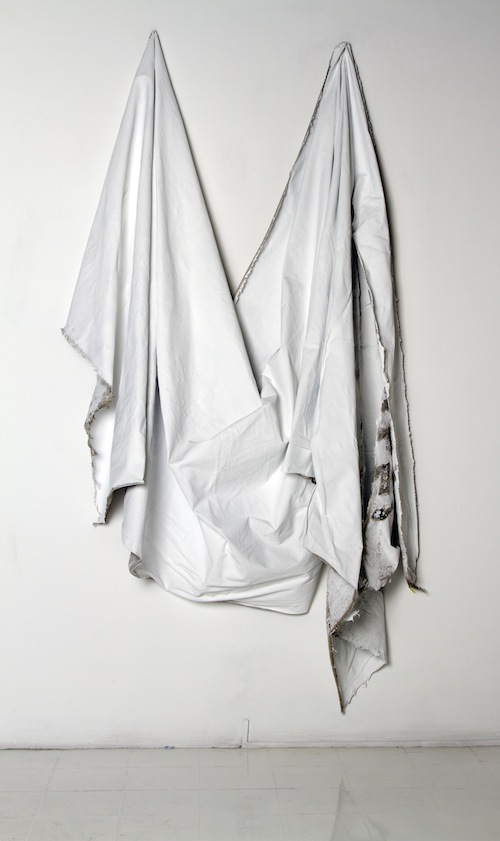 The muted signs are perhaps the most arresting elements exhibited, and their formal beauty recalls the process by which subversive cultural elements are quickly absorbed by the culture industry. Their stillness and plasticity reminds me of the draperies worn by Zurbarán’s and other Baroque masters’ unflappable saints, while the monochromatic character of the entire exhibit functions like white noise, representing an inability to communicate. The entire installation happens to be yet another way to note the buzzing sound of pointless protests, the stillness of the status quo. Overall, Segura’s sharp cynicism remains, but has shifted from anger towards a sad rumination on the frail indexes of protest. That these works are exhibited at a commercial gallery is no accident–it is only the natural result of art’s place within the cycle of co-option.
