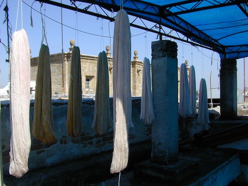 As for the entire process employed at the Taller, Rafael and his brother Leopoldo demonstrated how the wool is dyed, measured, woven, and finally, mounted onto another piece of fabric. They use synthetic dyes, since they are better able to achieve the desired colors with these materials. When weaving, they employ about three threads per square centimeter, significantly fewer than the thirty threads that were used in the past and that some workshops still employ. (Most operating workshops use three threads).