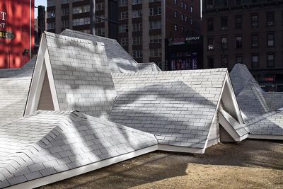 Finally, David Brooks talks about Desert Rooftops being “instigated” by the space in Times Square but I think it actually plays a little tug-of-war with it. These rooftops, seeming to grow like weeds from the small plot, are practically being watched and scrutinized by the surrounding buildings that tower over them. They spread throughout the plot quite freely yet the fence reminds everyone that this is the end- this is the edge of the frame. And in this way the work goes on to speak about both sprawl and a kind of containment.