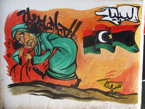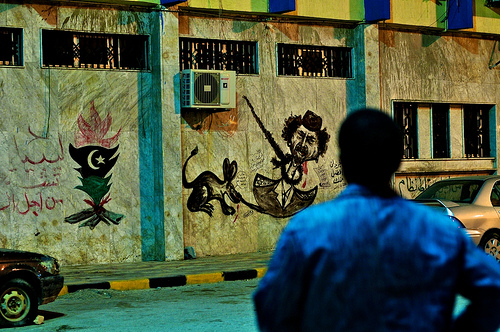 Perhaps no country makes better use of undermining the image of a president’s face than Libya, where Muammar Gaddafi is still the subject of most graffiti, much of which humorously depicts him as a rat, ape or vampire. One mural mocks his hair by calling it “barbed wire hair” while another satirizes his self-declaration “king of kings of Africa” by calling him the “monkey of monkeys of Africa.” Yet intermixed with Gaddafi as the butt of suppressed jokes are other serious, introspective pieces that look at themes of war, nationalism and the still uncertain future for Libya.