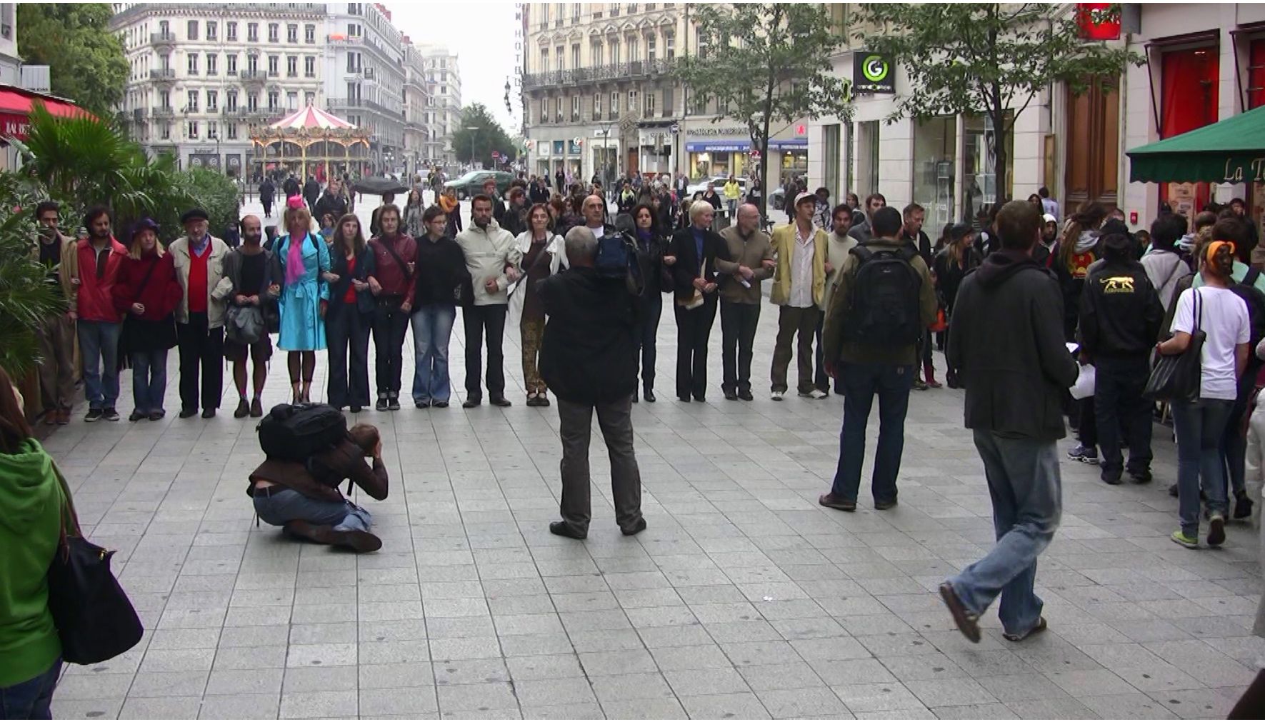 In Athens, it was the most… During the street demonstrations times, and everyone was out of work, the economic system was collapsing. We just invited the people, and many people came, and we cut the flow of one of the narrow streets. And when people saw, they would just stop and ask, “What is it about?” They just wanted to know what it was about, and they wanted to join or they wanted to be against us. But in Skopje, the situation was really different. There, people were repressed by the police and the state, and the whole city was under construction, and they had a kind of police state there. When we made the performance there, and we made no reaction to the people, they got really angry, and they started to be violent. They were trying to break our arms and saying, “Go to hell, out of my way,” it was really violent. Also in Lyon, when we did it, it was also very violent but in a different way, it had to do with the consciousness of being a European citizen. Because you cannot cut the flow of any European citizen. It’s their right to walk on the streets.