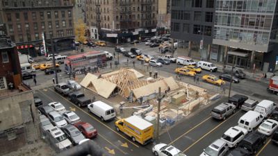 First, very few roofers, even fancy ones, are being approached or directly involved with the Art Production Fund, who arranged for David Brooks to complete the project at this particular site- the last piece of empty, undeveloped space in Times Square. Works installed here, including a recent installation by Kiki Smith, have a connection to the surrounding area or make a connection in the work to the context itself. A “creative roofer” could not simply propose a similar project out of nowhere, and even if they did they wouldn’t be telling the same story or making the same associations, so it would be a completely different work even it looked exactly the same.