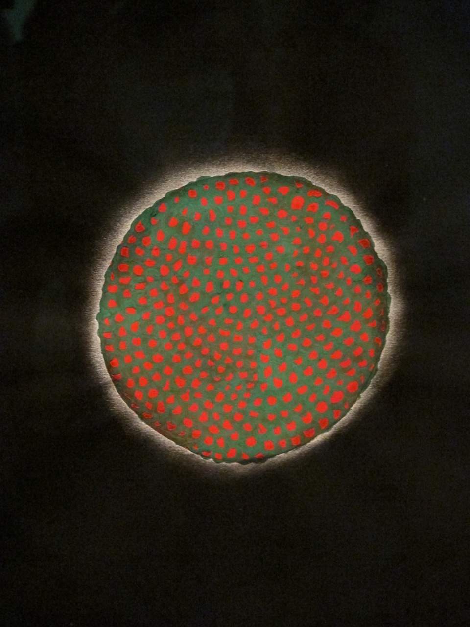 Yayoi Kusama’s obsessions with dots, interlace patterns, decorative and plastic spaces connect to astronomy that, as artist Dorothea Rockburne states, “combines shapes, math, metaphysics and feelings that the cosmos will continue to exist long after the lives of humankind.” Rockburne sees reality as a continuum in which human beings embody aspects of space’s vast, largely uncharted immensity, as well as contain the still-mysterious realm of subatomic particles. Matthew Ritchie and Josiah McElheny explore the idea of the universal cell or structure as part of a representational (particle) system. Kusama has recently spoken about her lifelong interest in particle systems, i.e. how “human beings are all represent dots; a single particle among billions. This is one of my important philosophies, which is accepted by many people.” Like Charles and Ray Eames’ film Powers of Ten, Kusama’s works often depict the relative scale of the universe in multiple contexts. Arts and science are similar in that they are expressions of what it is to be human in this world and Kusama’s dot-based canvases are part of the art-science ethos that, according to Cern research artist Ariane Koek is “unsubtle and still evolving.”