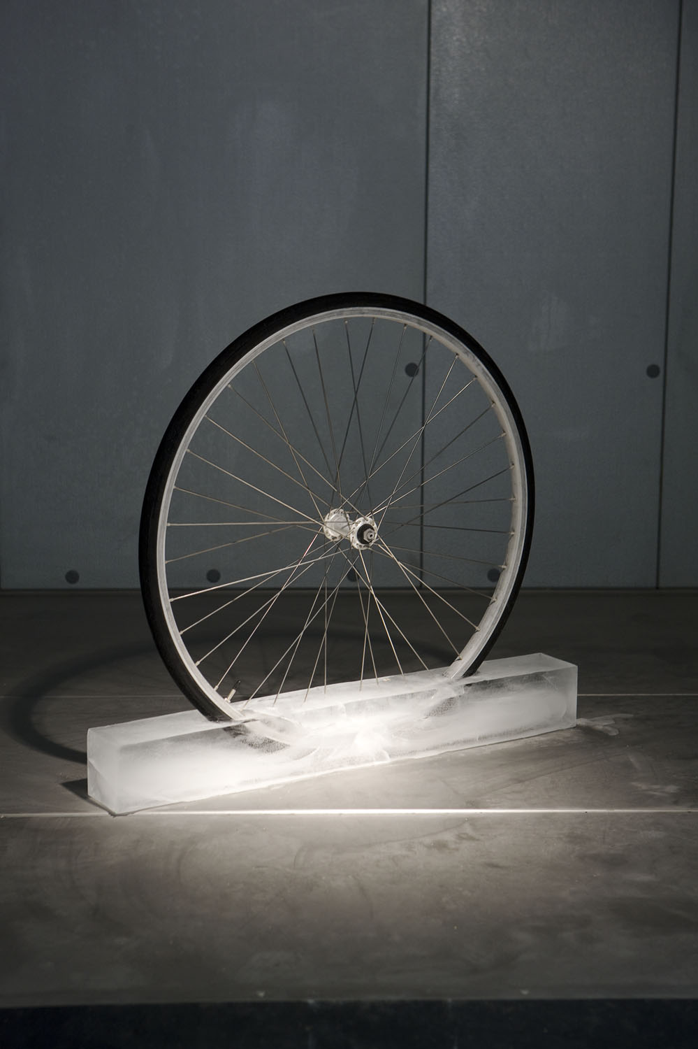 Roman Signer. "Rad (Wheel)," 2008. Bicycle wheel, ice, 31 x 42 x 7 inches. Courtesy the artist and Rochester Art Center.
