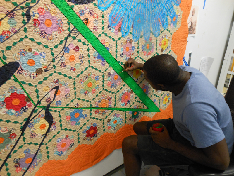 Sacred geometry (geometric design) and raw cotton “clouds” figure into his work, as seen in another quilt I saw him working on this week. Here, you can see Julie Mehretu‘s influence, as well as other motifs seen in Codex such as Lotus, Biggers’ “highly stylized,” twenty-four-petal filigree pattern in the shape of a flower.